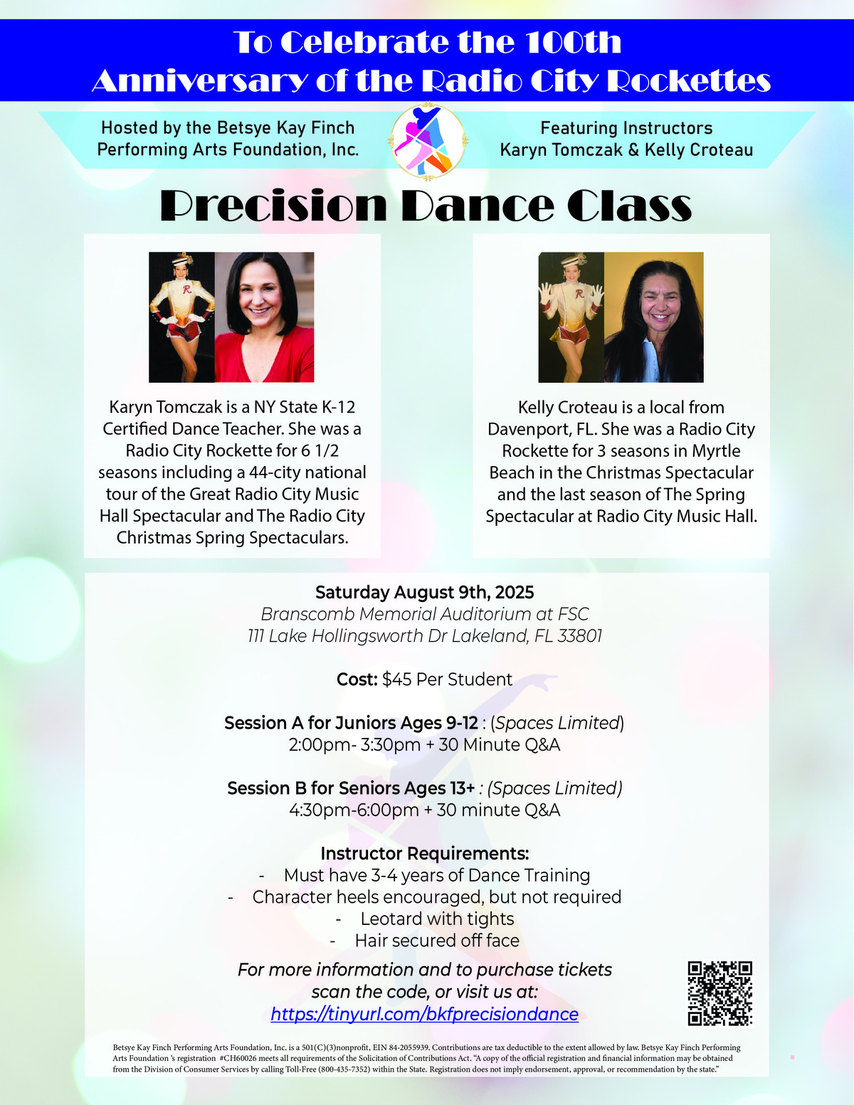 Contact: Alexis Rocker Betsye Kay Finch Performing Arts Foundation, Inc Phone: (859) 912-2649 Email: info@bkfperformingarts.org www.bkfperformingarts.org ___________________________ PRESS RELEASE Lakeland, FL, June 25, 2025: Precision Dance Class Dance Students: Kick Up Your Heels! The BKF Foundation will be hosting 2 former Radio City Rockettes to teach Precision Dance Classes on Saturday, August 9th, at Florida Southern College's Branscomb Auditorium in Lakeland. Teaching the classes will be: Karyn Tomczak, a NY State K-12 Certified Dance Teacher, and former Radio City Rockette. She performed for 6 ½ seasons including a 44-city national tour of the Great Radio City Music Hall Spectacular and The Radio City Christmas Spring Spectaculars. Kelly Croteau, from Davenport, FL, was a Radio City Rockette for 3 seasons in Myrtle Beach in the Christmas Spectacular and the last season of The Spring Spectacular at Radio City Music Hall. This year is the 100th Anniversary of the Radio City Rockettes and this is our way of offering outstanding dance instruction & talent to our area. This opportunity has two separate sessions: Junior Dancers (ages 9-12) and Senior Dancers (ages 13+). The instructors require that all students must have 3+ years of dance training. Each 2 hour session is $45/student and includes a 30 minute Q&A. Space is Limited! Enroll at: https://tinyurl.com/bkfprecisiondance For details see attached flyer. Betsye Kay Finch Performing Arts Foundation, Inc, is a registered 501(c)(3) nonprofit organization, EIN: 84-2055939. Contributions are tax-deductible to the extent allowed by law. The Betsye Kay Finch Performing Arts Foundation, Inc., registration number CH60026, meets all requirements specified by The Florida Solicitation of Contributions Act. “A copy of the official registration and financial information may be obtained from the Division of Consumer Services by calling Toll-Free (800-435-7352) within the State. Registration does not imply endorsement, approval, or recommendation by the state.”
